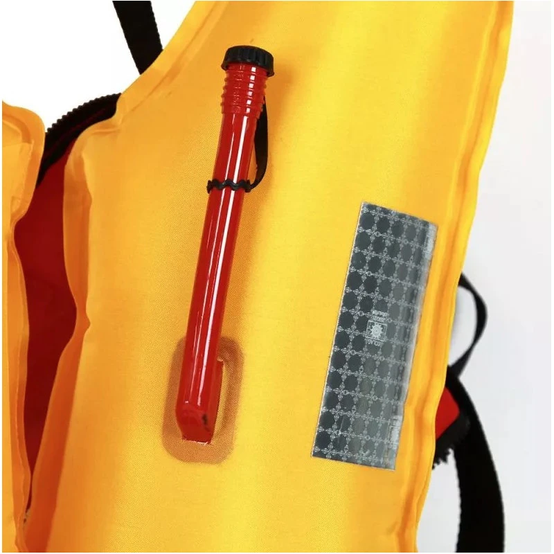 Le gilet de sauvetage gonflable Essential Orangemarine est équipé d’un tube pour gonfler le gilet avec la bouche et pour dégonfler le gilet, ainsi que d’un sifflet pour que le porteur puisse signaler sa présence !